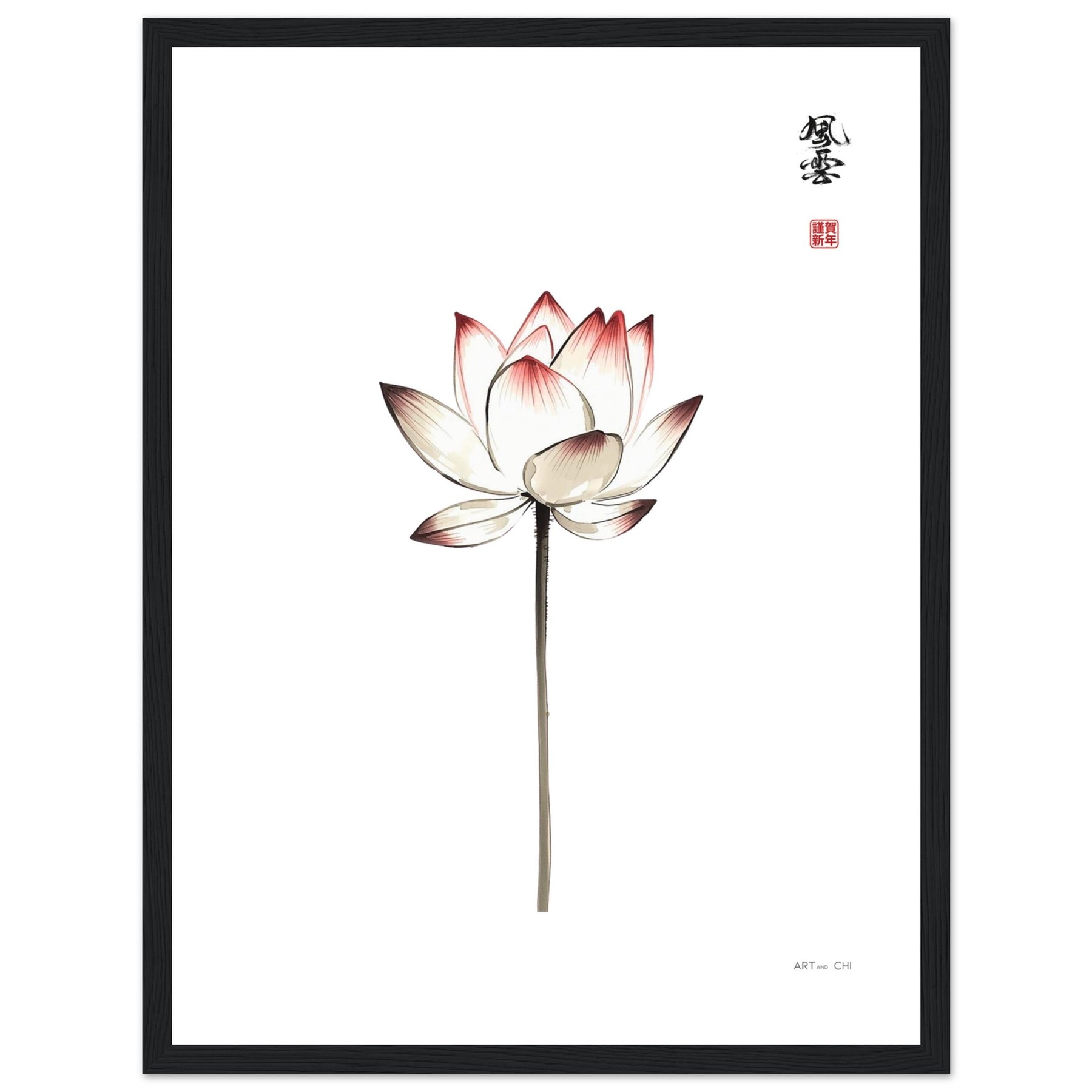 Laa flor de loto, con un estilo minimalista y sumi-e japonés evoca la energía del elemento Madera Yin. Representa el valor de la superación, la resiliencia ante situaciones que parecen muy complicadas de solucionar, posee una fuerza interior pura cuyo foco es alcanzar la luz.