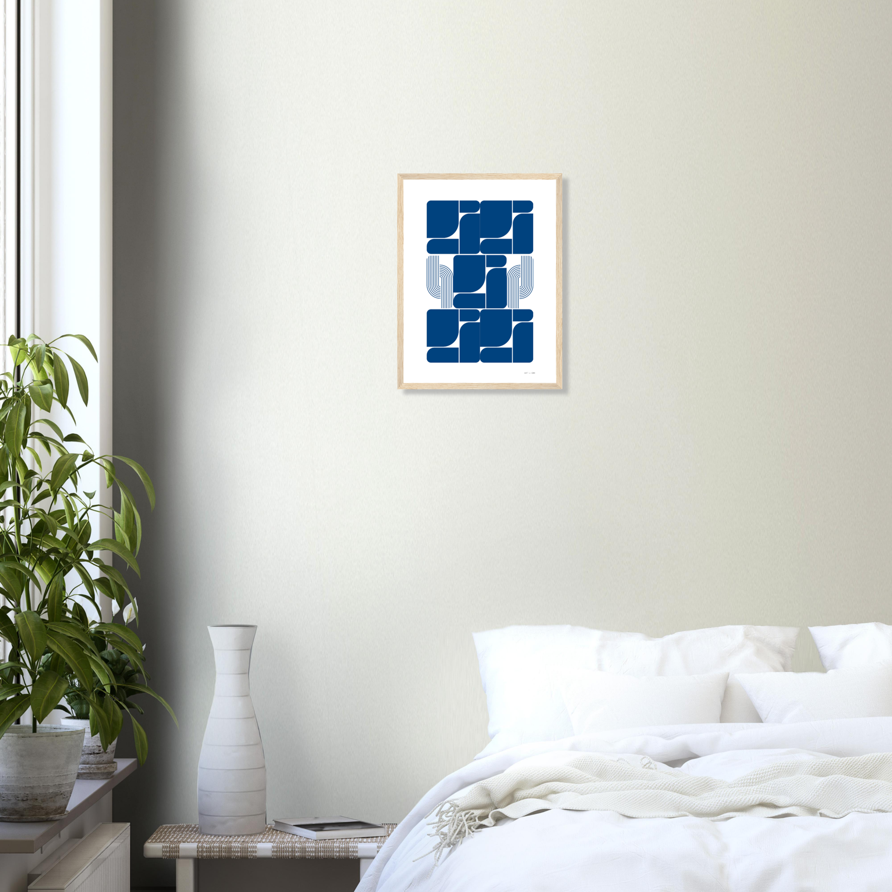La lámina Formas del Agua está inspirado en el azul oceánico del Atlántico, con un patrón geométrico de inspiración contemporánea. Es el color del mar de la zona donde vivo, en Galicia, aquí el agua es profunda, llena de minerales y algas, llena de vida. Los tonos azules conectan con el mundo interior, la intuición profunda y la capacidad de escuchar la voz interior, como el mar que guarda secretos en su profundidad.